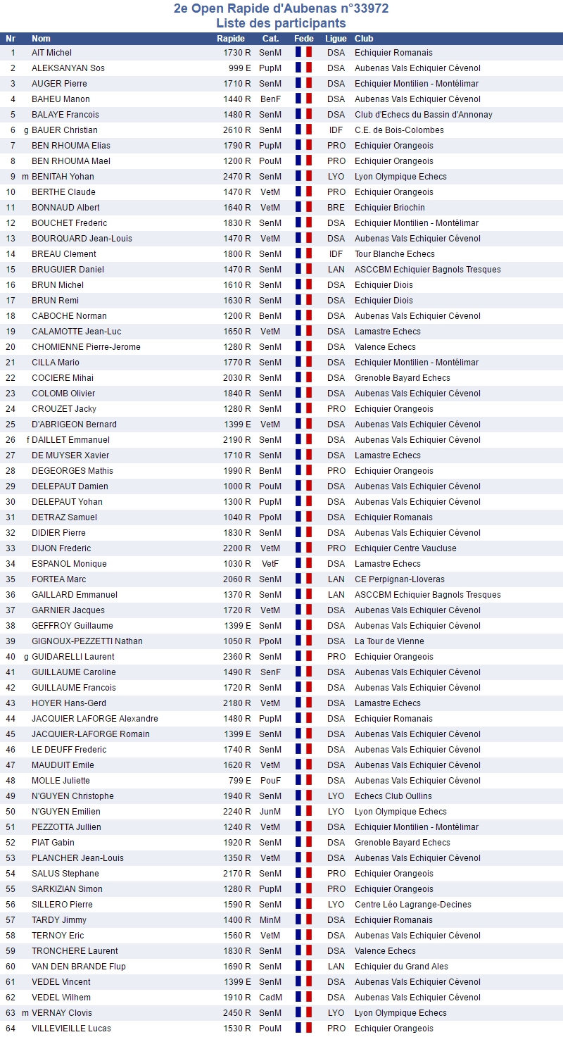 Seront aussi remis 30 € par tranches de catégories Elo.