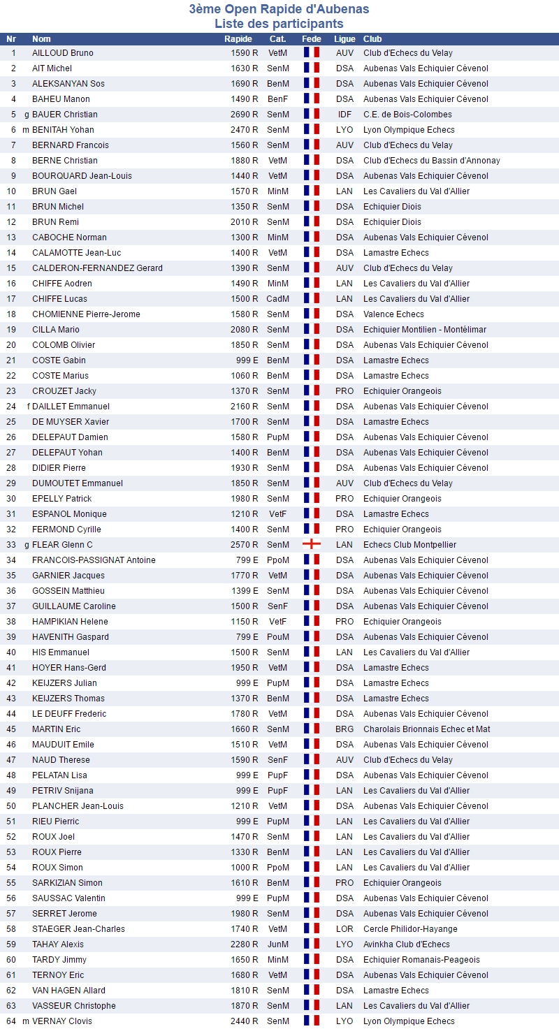 Seront aussi remis 30 € par tranches de catégories Elo.