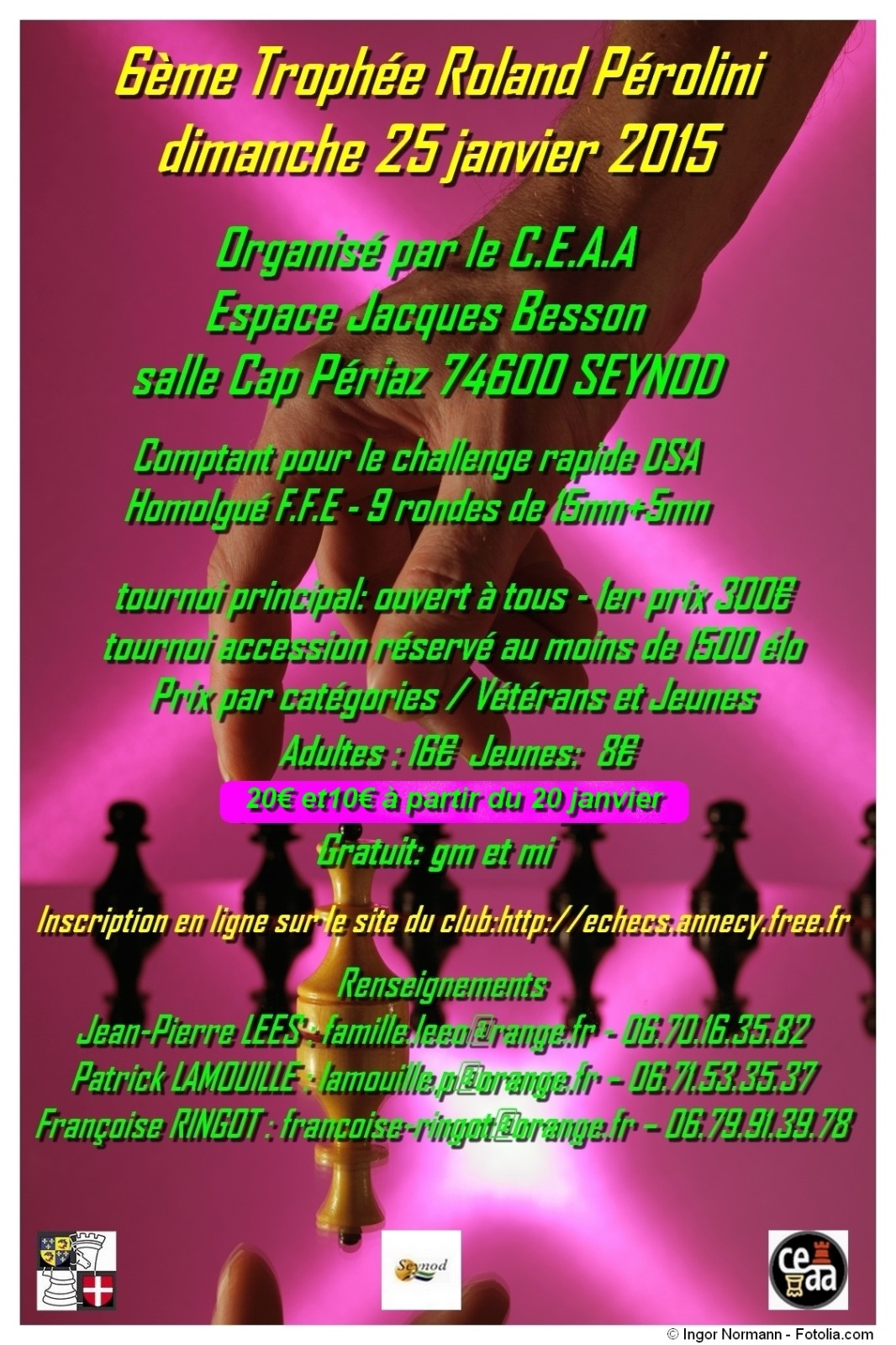 Le Cercle d'Échecs de l'Agglomération Annécienne organise le dimanche 25 janvier 2015 le 6ème Trophée Roland Pérolini. Il s'agit d'un open de parties rapides de 9 rondes homologué FFE, à la cadence de 2x15 minutes + 5 secondes par coup, composé de deux tournois : le "Principal", ouvert à tous, et un "Accession", réservé aux -1500 Elo.
