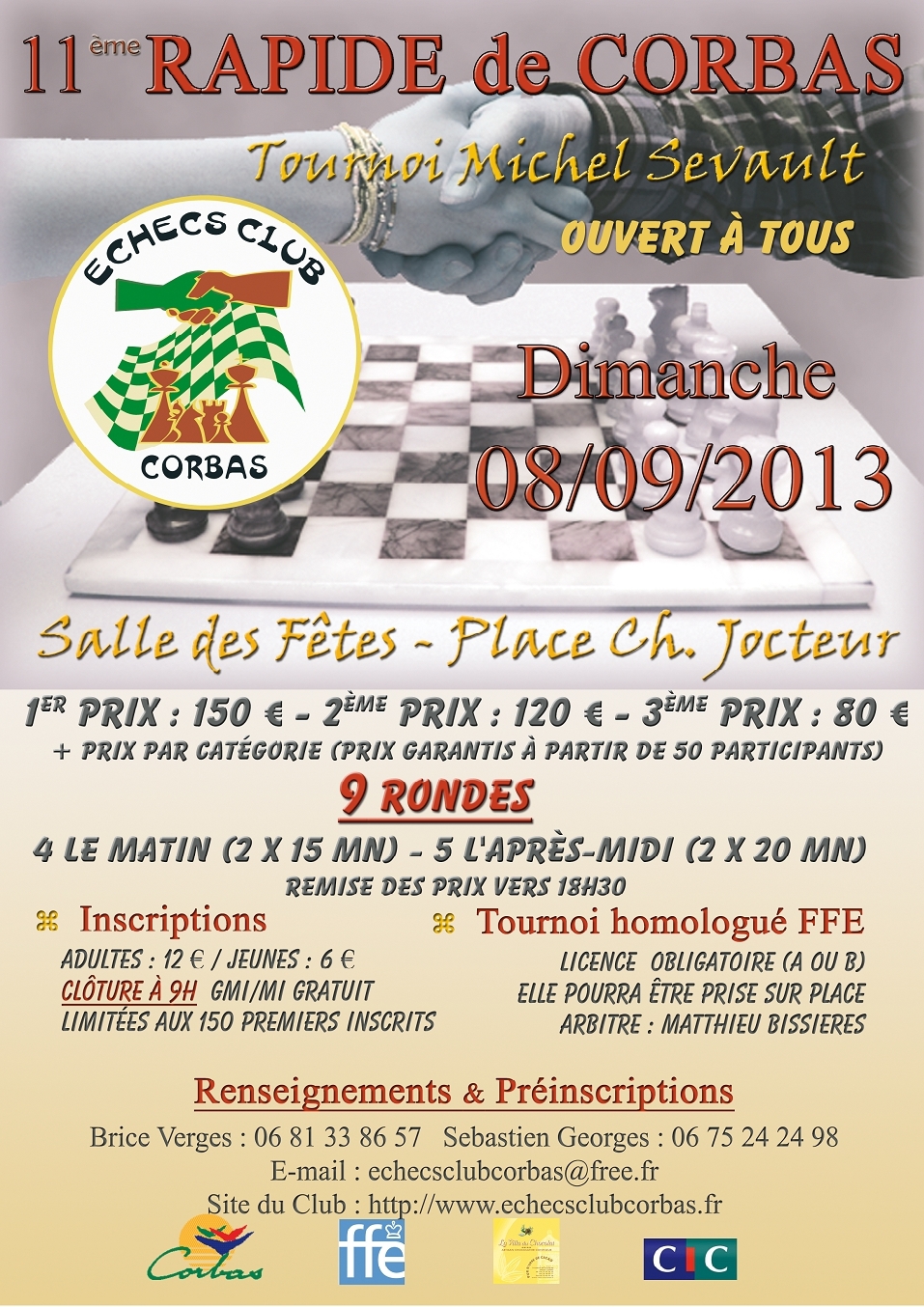 Pour vous inscrire ou pour obtenir tout renseignement supplémentaire, Monsieur Sébastien Georges (echecsclubcorbas@free.fr / 06 75 24 24 98) se tient à votre disposition. Vous pouvez également consultez le site internet du club de Corbas en cliquant sur le lien suivant : echecsclubcorbas.fr.