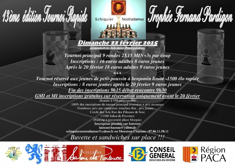 Comme à l'accoutumé depuis 2002, l'Échiquier Nostradamus organisera le dimanche 22 février 2015 la 13ème édition de son Trophée Fernand Pardigon.