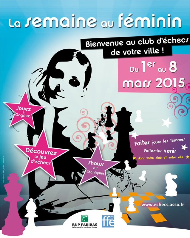 La Fédération française des échecs lance cette année encore l'opération « La Semaine au féminin 2015 » ! Elle se déroulera du 1er au 8 mars dans le cadre de la Journée Internationale de la Femme.