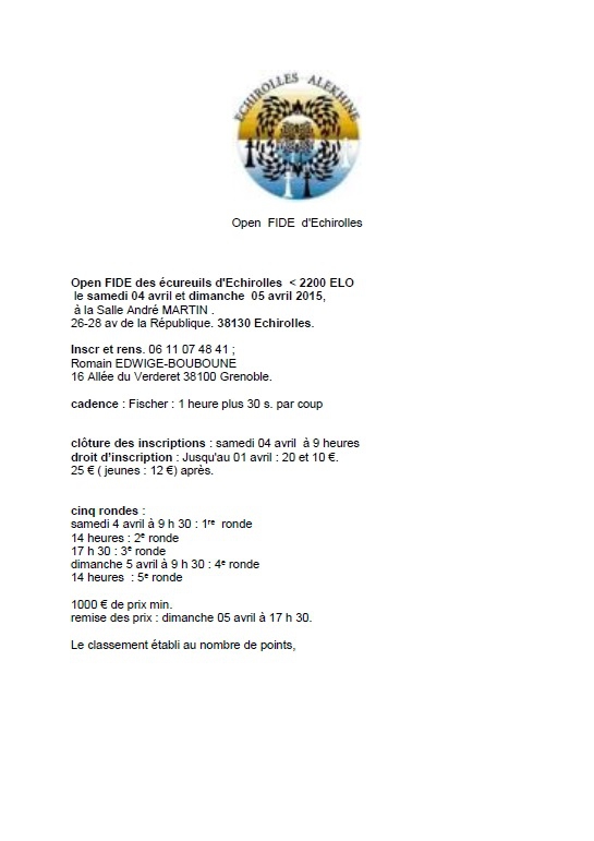 Du samedi 4 au dimanche 5 avril 2015 le club d'échecs Échirolles-Alekhine organisera son 12ème Open FIDE.