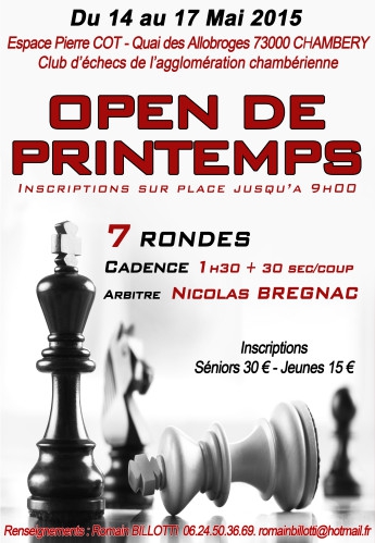 Comme à l'accoutumé, l'Open de Printemps de Chambéry aura lieu du 14 au 17 mai 2015 dans l'Espace Pierre Cot (Quai des Allobroges, 73000 Chambéry).