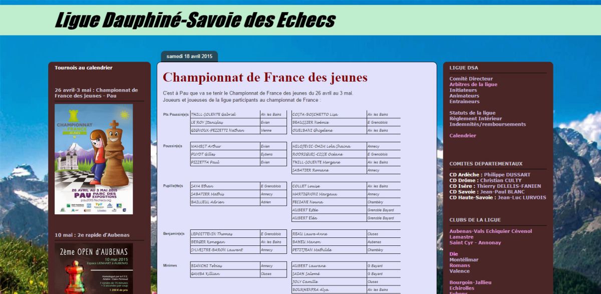 La Ligue Dauphiné-Savoie des échecs est heureuse de vous présenter son nouveau site internet, disponible à l'adresse suivante : liguedsa.blogspot.fr.