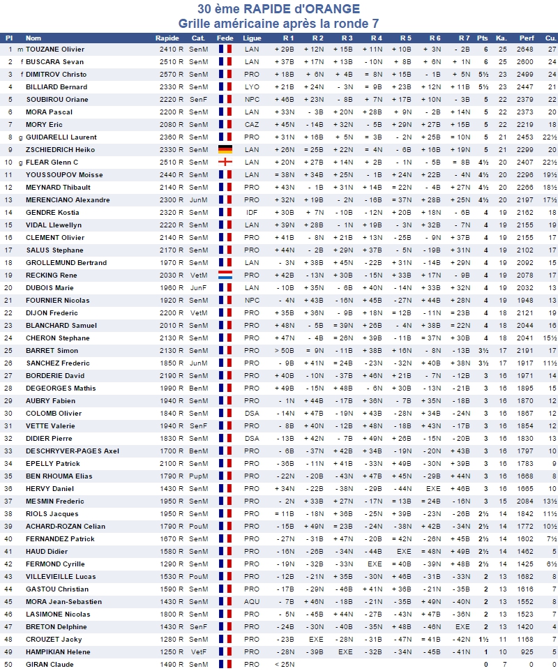 Dans le haut du tableau, c'est le Maître International Olivier Touzane (2410 Elo) qui l'a emporté au départage devant le nîmois Sevan Buscara (2510 Elo) qui comptaient chacun 6/7. Le Maître FIDE Christo Dimitrov (2570 Elo) ferme quant à lui la marche avec 5.5/7.