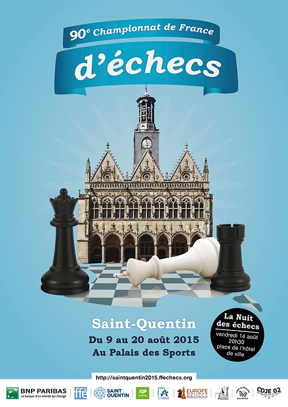 Après Nîmes en 2014, c'est la ville de Saint-Quentin (02100) qui aura le privilège d'accueillir du 9 au 20 août 2015 la 90ème édition du Championnat de France d'échecs. Ce championnat, rassemblant habituellement de 700 à 900 joueurs, est composé de 8 tournois : d'abord 3 tournois "Nationaux" réservés aux meilleurs joueurs, puis 5 tournois par catégorie elo ouverts à tous les joueurs licenciés en France :