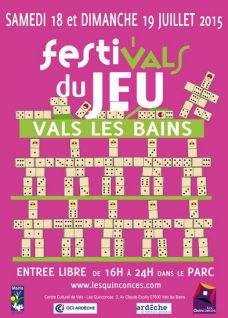 Le Centre Culturel de Vals-les-Bains organisera les samedi 18 et dimanche 19 juillet 2015 son Festival annuel du jeu au Parc de la ville de Vals-les-Bains.