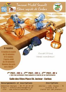 Le club d'échecs de Corbas organisera le dimanche 6 septembre 2015 son 13ème tournoi de parties rapides. Il s'agira d'un tournoi de 9 rondes, à la cadence de 2x15 minutes pour les rondes du matin, puis de 2x20 minutes pour celles de l'après-midi. Les parties se dérouleront dans la Salle des fêtes de Corbas (Place Charles Jocteur - 69960 Corbas).