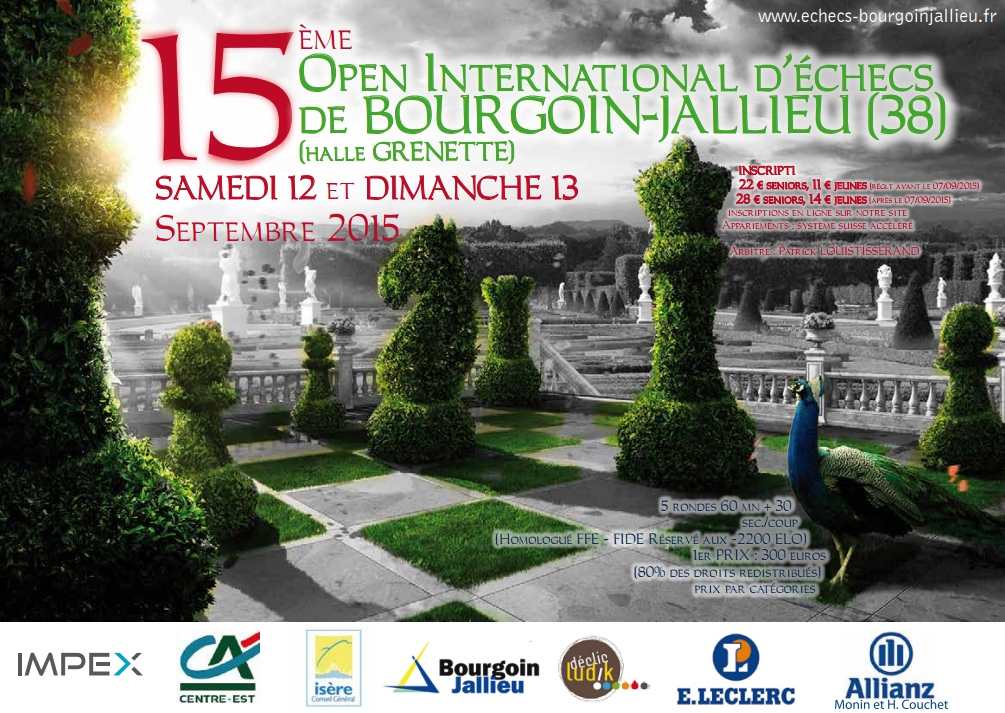 La Dame blanche de Bourgoin-Jallieu organisera les samedi 12 et dimanche 13 septembre 2015 la 15ème édition de son Open International d'échecs. Comme à l'accoutumé ce tournoi se décomposera en 5 rondes de 60 minutes + 30 secondes par coup, et se déroulera à l'Espace Grenette (Rue Grenette, Bourgoin-Jallieu - 38000).