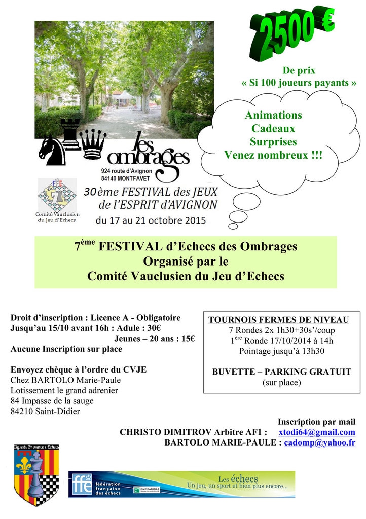 Le Comité Vauclusien du Jeu d'Échecs organisera pendant le 30ème Festival des jeux de l'esprit d'Avignon le 7ème Festival d'échecs des Ombrages, qui aura lieu du samedi 17 au mercredi 21 octobre 2015 au restaurant "Les Ombrages" (924 Rue d'Avignon - 84140 Montfavet). Il s'agira d'un tournoi de 7 rondes jouées à la cadence d'1h30 + 30 secondes par coup.