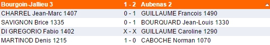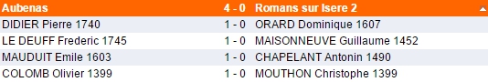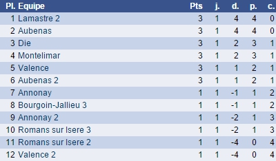 Dans les autres rencontres Die et Montélimar ont vaincu respectivement Romans 3 et Annonay 2 sur le même score de 3-1. Valence 1 a battu 2 à 1 l'équipe d'Annonay 1, alors que Lamastre 2 a écrasé 4 à 0 Valence 2. Aubenas 1 partage donc, à la différence de points, la première place avec Lamastre 2.