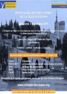 L'Échiquier des Papes et l'Association des Jeux de l'Esprit organiseront le dimanche 1er novembre 2015 le 29ème tournoi d'échecs du Festival en Avignon. Il s'agira d'un tournoi de parties rapides de 9 rondes, à la cadence de 15 minutes + 3 secondes par coup, qui se déroulera au Centre des Congrès du Palais des Papes dans la Salle Paneterie (Place Palais des Papes - 84000 Avignon).