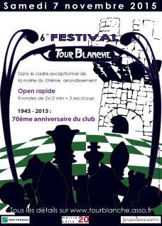 Le club d'échecs francilien de la Tour Blanche organisait ce samedi 7 novembre, à l'occasion de son 70ème anniversaire, son 6ème festival d'échecs dans le cadre exceptionnel de la mairie du XXème arrondissement de Paris. Il s'agissait d'un open de parties rapides de 9 rondes jouées à la cadence Fischer de 2x12 min. + 3 sec./coup.