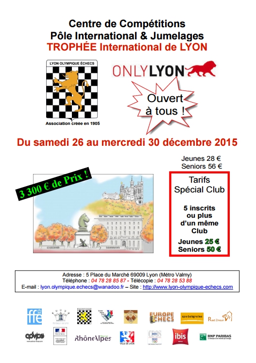Le Lyon Olympique Échecs organisera du samedi 26 au mercredi 30 décembre 2015 son 10ème Trophée International de Lyon. Homologué FIDE, ce tournoi, auquel participe chaque année de nombreux GMI, se jouera en 9 rondes à la cadence lente d'1h30 + 30 secondes/coup. Les parties se dérouleront dans les locaux du Lyon Olympique Échecs (5 Place du Marché - 69009 Lyon).