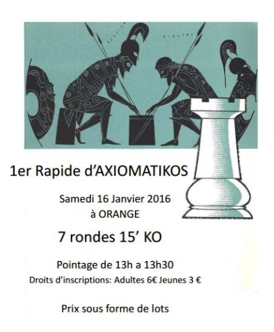 L'Échecs Loisirs Orangeois organisera le samedi 16 janvier 2016 le 1er Rapide d'Axiomatikos. Ce tournoi de 7 rondes de 15 minutes KO, ouvert uniquement aux joueurs de tous âges ayant moins de 1400 Elo Rapide, se déroulera dans les locaux du club orangeois (294 rue Roussanne - 84100 Orange).