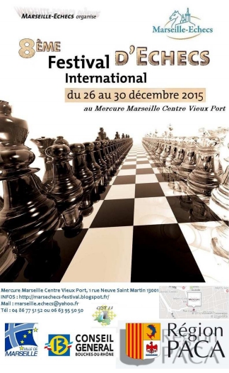 Le club Marseille Échecs organise du samedi 26 au mercredi 30 décembre 2015 le 8ème Festival International d'échecs de la cité phocéenne. Homologué pour les Elo FIDE et FFE, cet Open de 9 rondes, jouées à la cadence de 1h30 + 30 sec./coup, se déroulera dans les Salons "Méditerranée" de l'Hôtel Mercure - Centre Bourse (1 rue Neuve Saint Martin - 13001 Marseille).