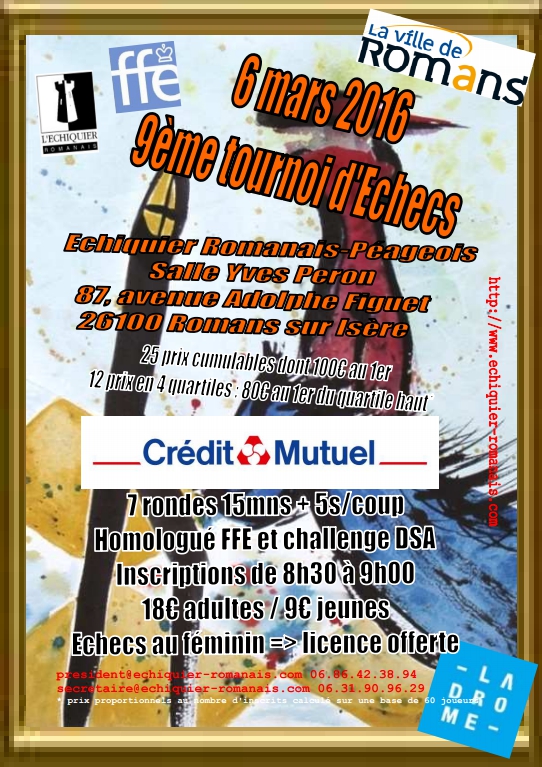 L'Échiquier Romanais organisera le dimanche 6 mars 2016 son 9ème Open d'échecs. Homologué FFE, ce tournoi de parties rapides se jouera en 7 rondes de 15 min. + 5 sec./coup, dans la Salle Yves Peron de la MJC Robert Martin de Romans-sur-Isère (87, avenue Adolphe Figuet - 26100 Romans-sur-Isère). Le pointage des participants se fera le matin de 8h30 à 9h00.