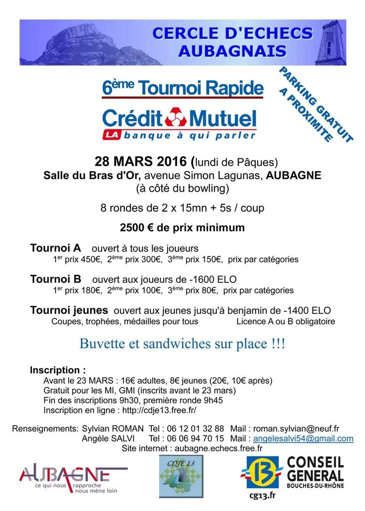Le Cercle d'Échecs Aubagnais organisera le lundi 28 mars 2016 dans la grande salle du Bras d'Or (Avenue Simon Lagunas - 13400 Aubagne), son 6ème tournoi de parties rapides. Cet Open de 8 rondes à la cadence de 2x15 min. + 5 sec./coup se divisera en trois tournois :