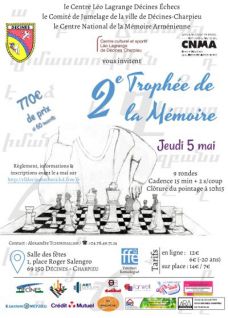 Après une première édition réussie l'année passée, le club d'échecs de Décines-Charpieu, en partenariat avec le Comité de Jumelage de la ville et le Centre National de la Mémoire Arménienne, organisera le jeudi 5 mai 2016 la deuxième édition du Trophée de la Mémoire.