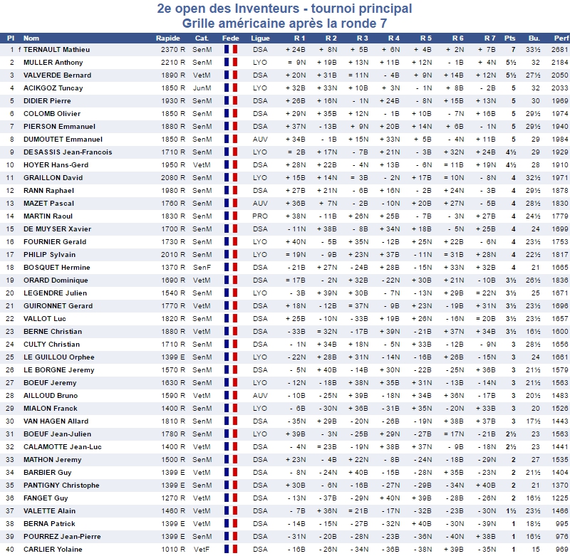 Le tournoi a été remporté haut la main par le Maître FIDE Mathieu Ternault (2370 Elo) avec 7/7. Il devance Anthony Muller (2210 Elo) et Bernard Valverde (1890 Elo) qui comptaient chacun 5.5/7.