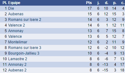 Dans les autres rencontres, Die a pratiquement assuré son second titre consécutif après avoir aisément disposé d'Annonay 1 (1-3). L'équipe de Romans-sur-Isère 2 a écrasé Bourgoin-Jallieu 3 (0-4) alors que Lamastre 2 a chuté contre Romans-sur-Isère (3-1). Surprise tout de même puisque dans le duel opposant les deux équipes du club d'échecs de Valence, l'étonnante équipe 2 a réalisé l'exploit de venir à bout de l'équipe première (1-2). Au classement, Aubenas 1 profite des contre-performances de Valence 1 et Annonay 1 pour occuper seul la 2ème place. L'équipe 2 reste 12ème.