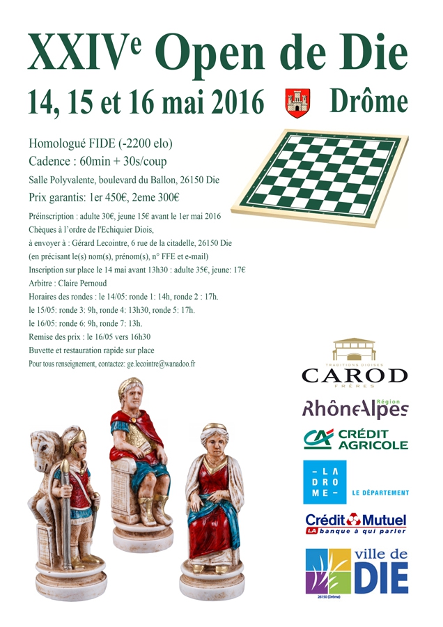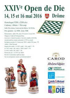 Le 24ème Open d'échecs de Die se tiendra cette année les 14, 15 et 16 mai prochains. Ce tournoi de 7 rondes à la cadence lente de 60 min. + 30 sec./coup, homologué FIDE et réservé aux joueurs de moins de 2200 Elo, se déroulera dans la Salle Polyvalente de Die (Boulevard du Ballon - 26150 Die).