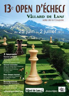L'Échiquier Grenoblois organisera du 25 juin au 2 juillet 2016 la 13ème édition de l'Open d'échecs de Villard-de-Lans dans la Salle de la Coupole (Place Mure Ravaud - 38250 Villard-de-Lans). Profitant du cadre exceptionnel du massif du Vercors, cet open se décomposera en deux tournois :