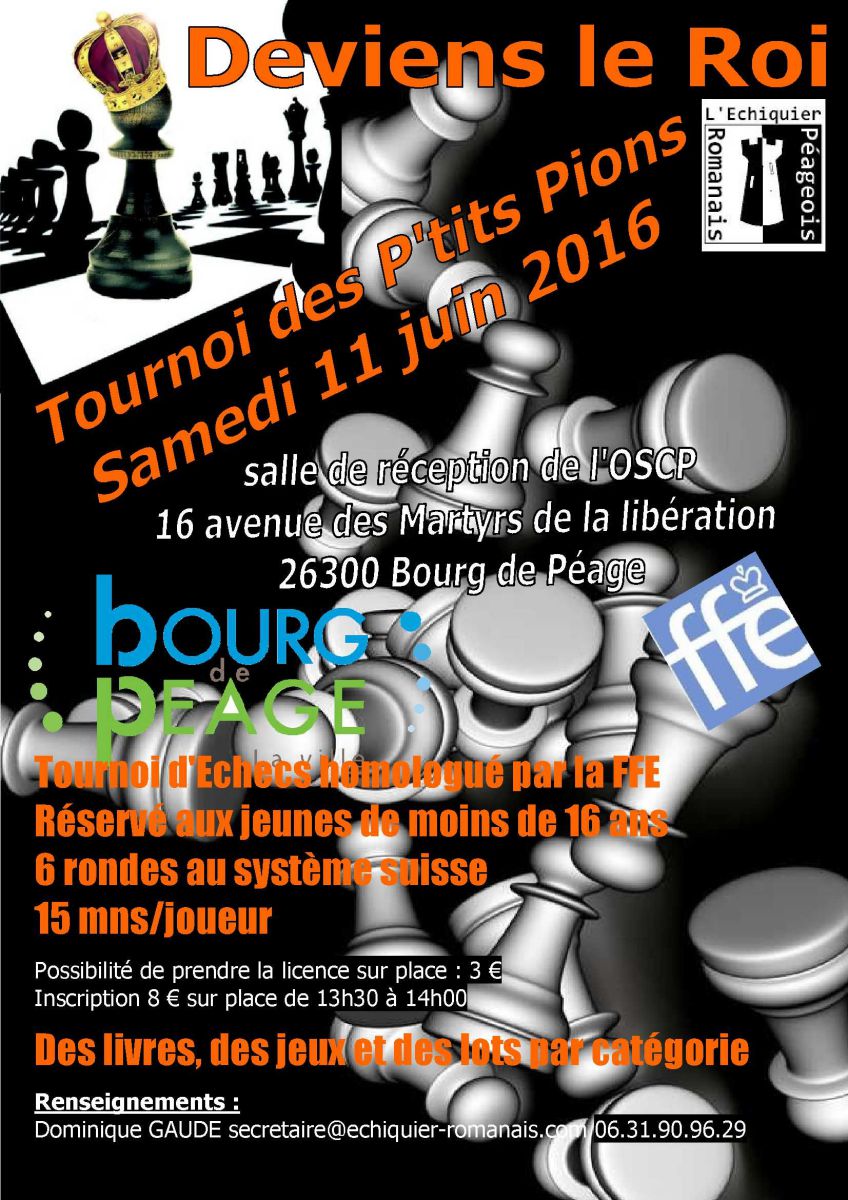 L'Échiquier Romanais-Péageois organisera le samedi 11 juin 2016 son 5ème Tournoi des P'tits Pions.