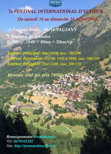 Le 7ème Festival International d'échecs de Vaujany se déroulera du samedi 16 au dimanche 24 juillet 2016 dans l'Espace Loisirs de Vaujany (108 Route des Combes - 38114 Vaujany). À l’instar de l'édition précédente, cet open de 9 rondes d'1h40min./40 coups + 40min. KO + 30sec./coup se décomposera en trois tournois de niveaux différents :