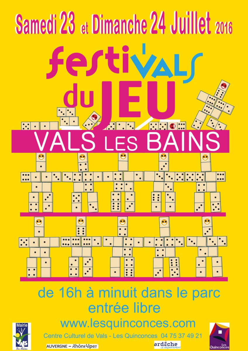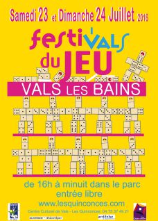 Le Centre Culturel de Vals-les-Bains organisera les samedi 23 et dimanche 24 juillet 2016 son Festival annuel du jeu au Parc de la ville de Vals-les-Bains.
