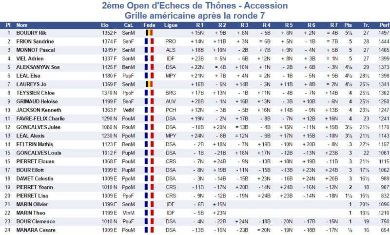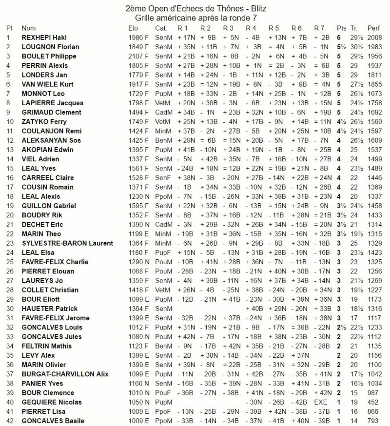 Puis dans le tournoi à proprement parlé, Sos a terminé aux termes des 7 rondes à une belle 5ème place en cumulant 4.5/7 ! Il n'est dévancé de peu que par le belge Rik Boudry (1352 Elo), vainqueur du tournoi avec 5.5/7, Sandrine Frion (1374 Elo) et Pascal Monnot (1249 Elo), respectivement 2ème et 3ème avec 5/7 chacun.