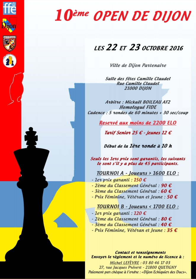 Le "Dijon Échiquier des Ducs" organisera les samedi 22 et dimanche 23 octobre 2016 le 10ème Open de Dijon.