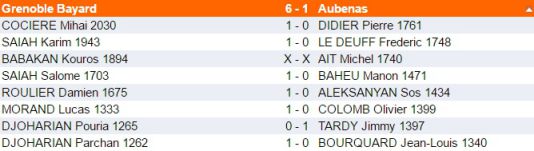 Michel a finalement fait nul ; la victoire était acquise à Grenoble Bayard... Restaient Manon et Sos qui jouaient depuis plus de quatre heures. Manon s'est inclinée dans la finale sur une étourderie. Sos, quant à lui, cherchant courageusement le gain en finale alors que le nul paraissait acquis, perd au bout de 5h40 de jeu et plus de 90 coups...