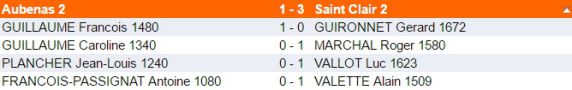 Dans le même temps l'équipe 2 s'est également inclinée largement contre la forte équipe 2 de Saint-Clair-du-Rhône. on notera la belle performance de François qui a diposé au premier échiquier d'un 1672 Elo.