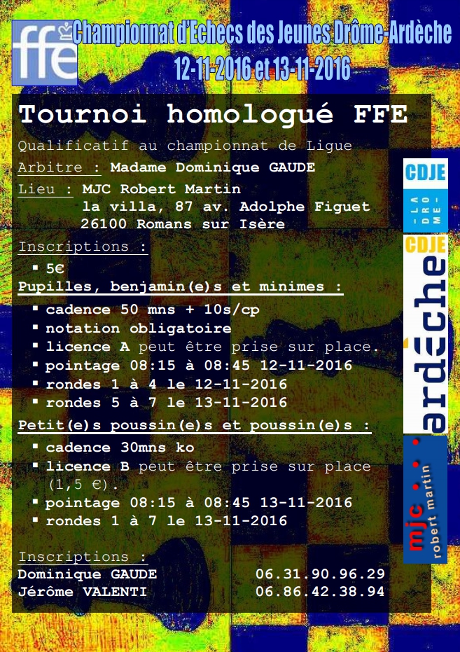 Une fois de plus, les comités départementaux d'échecs de Drôme et d'Ardèche organiseront en collaboration le Championnat d'échecs des Jeunes Drôme-Ardèche 2016. Ce tournoi qualificatif pour le Championnat régional de la Ligue Auvergne-Rhône-Alpes des échecs aura lieu les samedi 12 et dimanche 13 novembre 2016 à Romans-sur-Isère (MJC Robert Martin, 87 avenue Adolphe Figuet - 26100 Romans-sur-Isère). Le coût des inscriptions est fixé à 5 €.