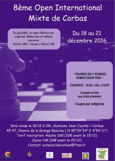 Le club d'échecs de Corbas organisera du dimanche 18 au mercredi 21 décembre 2016 ses 8ème Open Internationaux mixte et féminin. Il s'agira de deux tournois de 7 rondes, homologués FIDE, à la cadence lente d'1h30 + 30 secondes/coup, l'un ouvert à tous, l'autre exclusivement ouvert aux joueuses. Les parties se dérouleront dans le Gymnase Jean Jaurès de Corbas (41 Chemin de Grange Blanche - 69960 Corbas), et débuteront à 15h le dimanche.