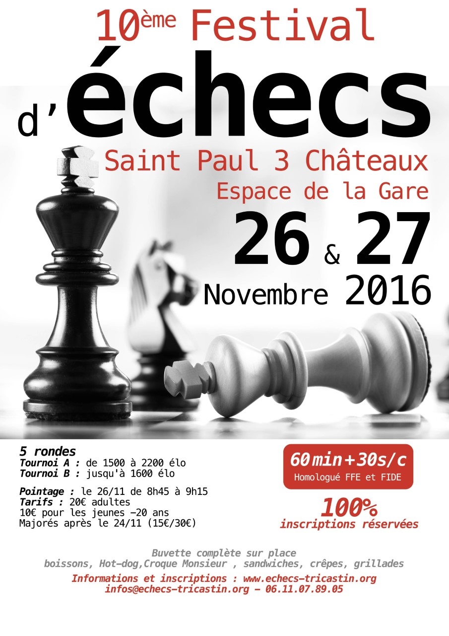 L'Échiquier tricastin organisera les samedi 26 et dimanche 27 novembre 2016 son 10ème Festival d'échecs de Saint-Paul-Trois-Châteaux.