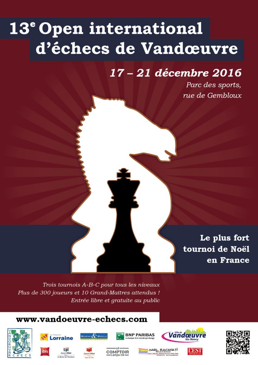 Le 13ème Open International de Vandœuvre, organisé par le club d'échecs de Vandœuvre-lès-Nancy, aura lieu du samedi 17 au mercredi 21 décembre 2016.