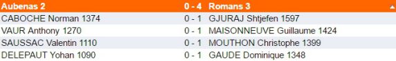 Cette fois-ci, c'est Olivier au 6ème échiquier qui très vite a pris l'avantage sur un début original, et qui après avoir fait exploser le centre, a rapidement gagné ! Une jolie miniature (1 - 0 pour Aubenas) !