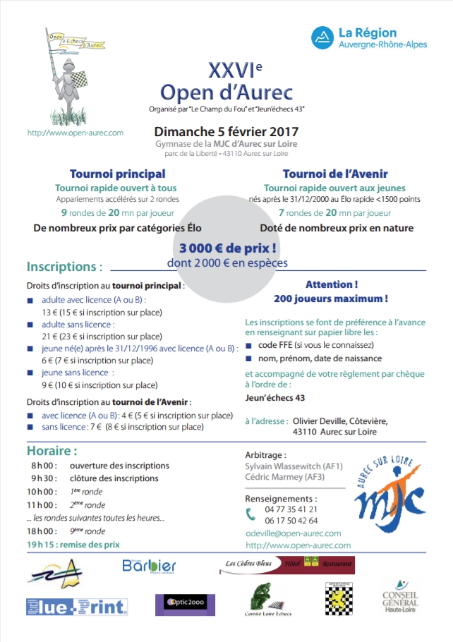 Le Club d'Échecs du Velay organisera le dimanche 5 février 2017 le 26ème Open d'échecs d'Aurec.