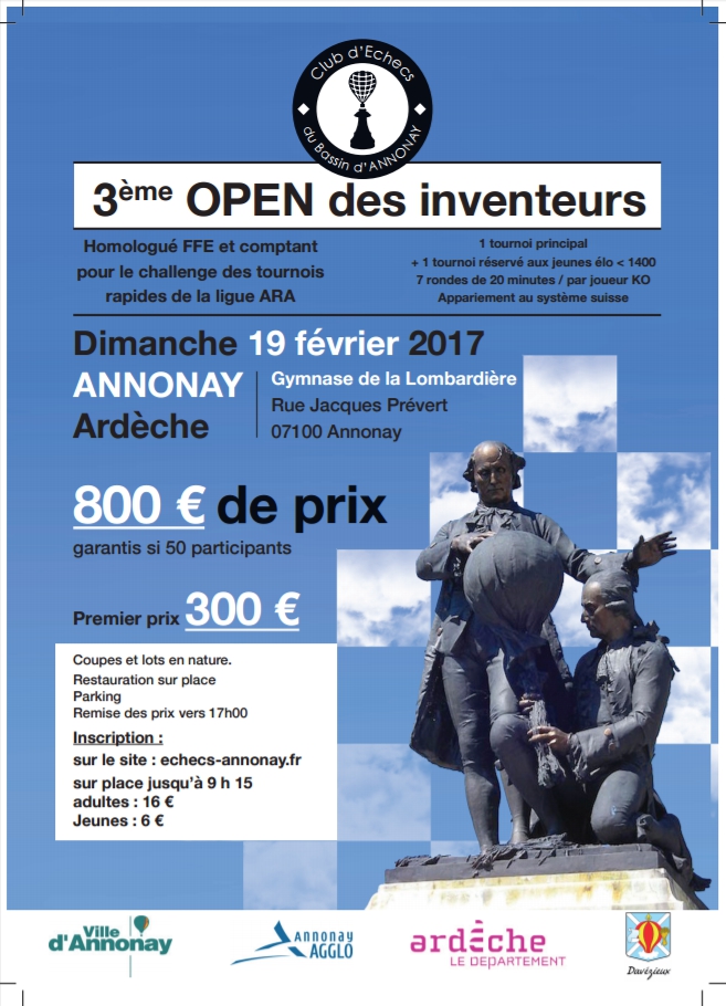 Après deux premières éditions réussies, nos voisins et amis du Club d'Échecs du Bassin d'Annonay organiseront leur 3ème Open des Inventeurs le dimanche 19 février 2017.
