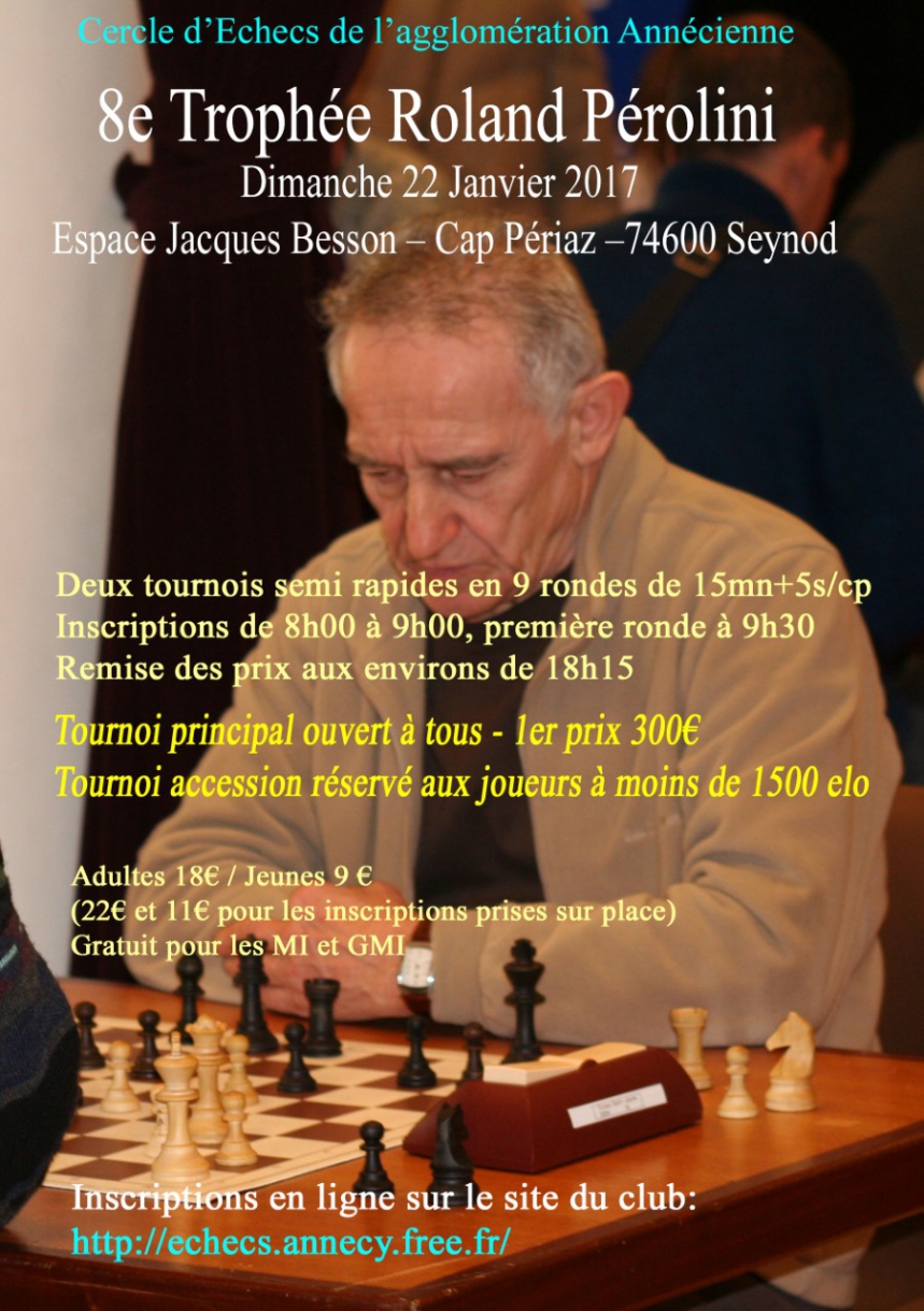 Le 8ème Trophée Roland Pérolini, organisé par le Cercle d'Échecs de l'Agglomération Annécienne, se tiendra le dimanche 22 janvier 2017 en l'Espace Jacques Besson (Cap Periaz, route de Periaz - 74600 Seynod). Divisé en deux évènements (le Principal ouvert à tous, l'Accession réservé aux joueurs de -1500 Elo), ce tournoi de parties rapides homologué FFE, se jouera en 9 rondes de 15 min. + 5 sec./coup.