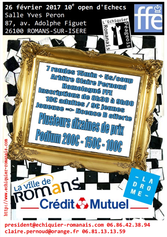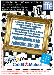 L'Échiquier Romanais organisera le dimanche 26 février 2017 son 10ème Open d'échecs. Homologué FFE, ce tournoi de parties rapides se jouera en 7 rondes de 15 min. + 5 sec./coup, dans la Salle Yves Peron de la MJC Robert Martin de Romans-sur-Isère (87, avenue Adolphe Figuet - 26100 Romans-sur-Isère). Le pointage des participants se fera le matin de 8h30 à 9h00.