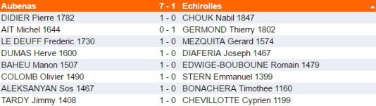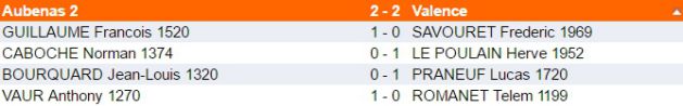 Sos et Jimmy, nos deux derniers échiquiers, ont rapidement pris l'avantage et Sos s'est imposé en 26 coups (1 - 0 pour Aubenas). Jimmy confirmera son avantage, gagnant une pièce et amènera le deuxième point pour Aubenas (2 - 0).