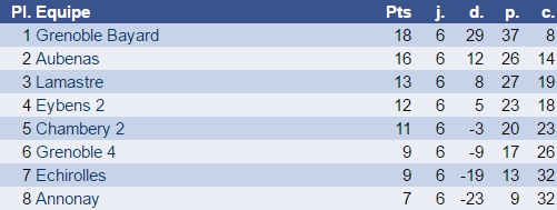 Notre équipe rencontrait cet après-midi celle d'Échirolles, 7ème au classement général. La rencontre avait lieu à Bourg-de-Péage où d'autres rencontres de Régionale avaient lieu ce qui nous a permis de retrouver notamment la toujours sympathique équipe de Die.