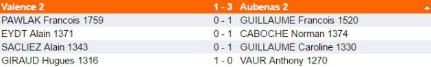 Les autres parties semblaient équilibrées, mais petit à petit, coup après coup, avec tenacité, chacun va prendre la mesure de son adversaire, gagnant de l'espace, voire un pion par-ci, une pièce par là, amenant ainsi un à un les points victorieux à l'équipe. Olivier a ainsi gagné, puis Manon, suivi de Pierre, Michel et Frédéric pour finir. Résultat final : 6 à 1 pour Aubenas.