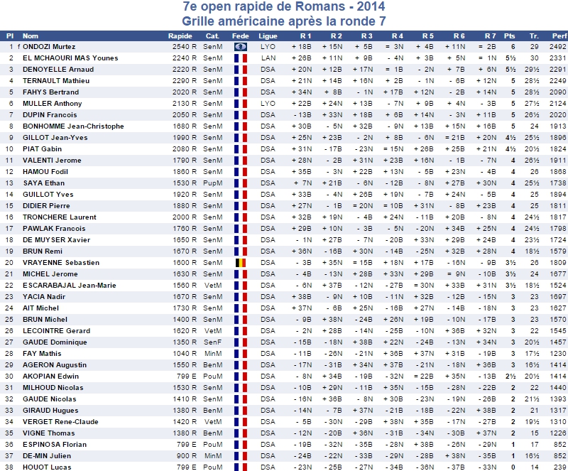 L'Échiquier romanais organisait ce dimanche 2 mars 2014 le 7ème Open de Romans-sur-Isère. Il s'agissait d'un tournoi de parties rapides de 7 rondes, jouées à la cadence de 15 minutes + 5 secondes par coup.