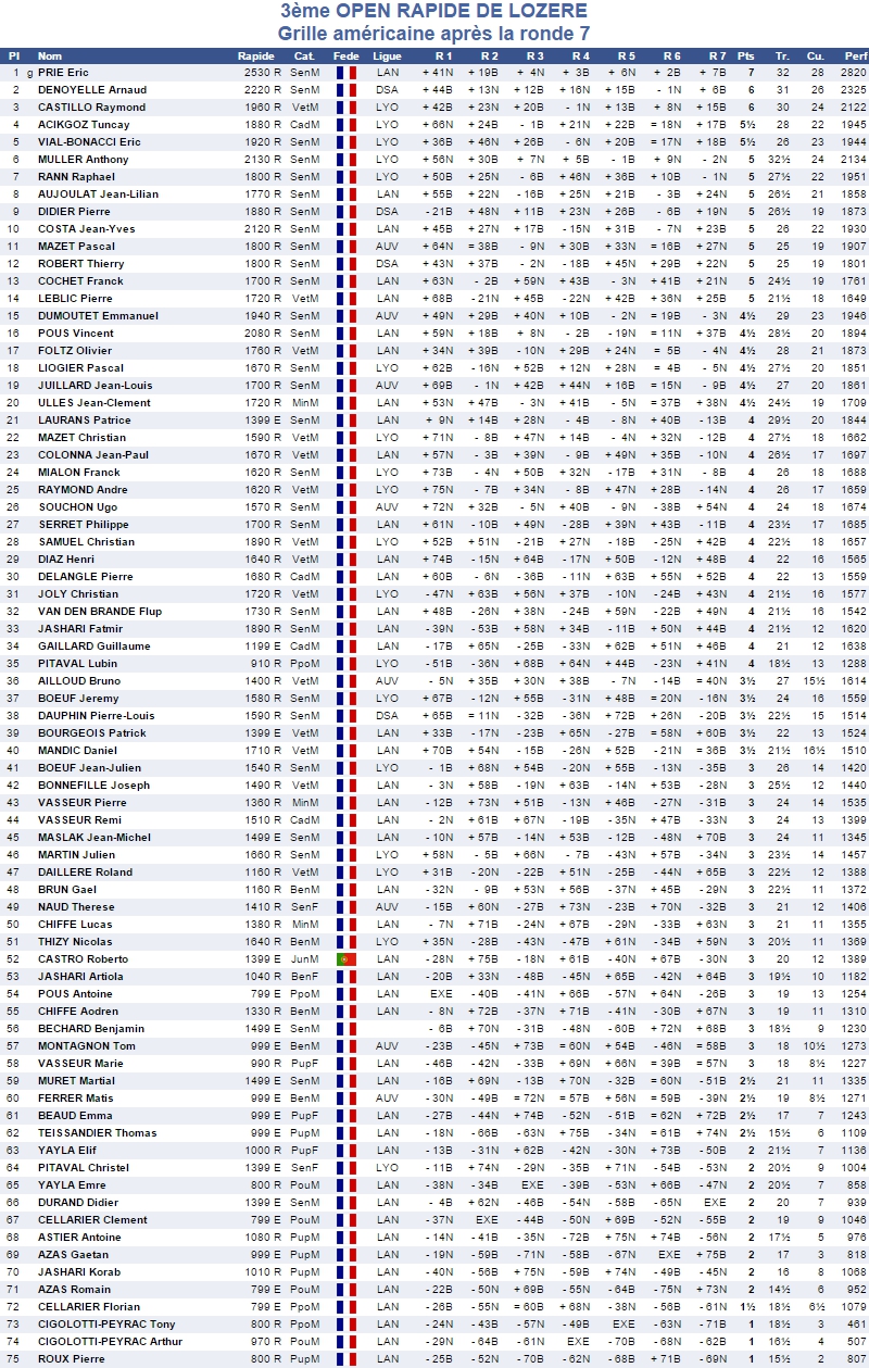 Disons tout de même que c'est le Grand Maître international Éric Prié (2530 Elo) qui l'a facilement emporté avec 7 points sur 7. Il devance au classement Arnaud Denoyelle (2220 Elo) et Raymond Castillo (1960 Elo).