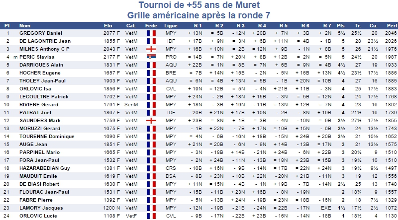 C'est Daniel Grégory (2077 Elo) qui s'est imposé avec 5.5/7, devant Jean de Lagontrie (1855 Elo) et Anthony Milnes (2043 Elo) avec chacun 5/7.